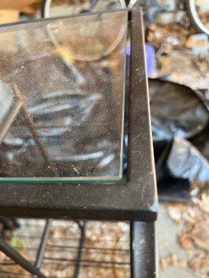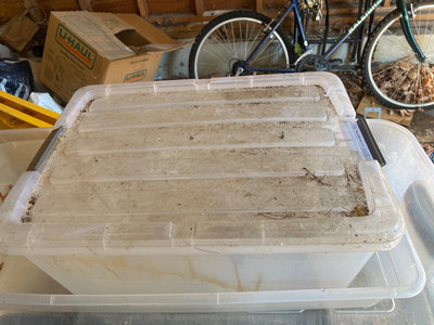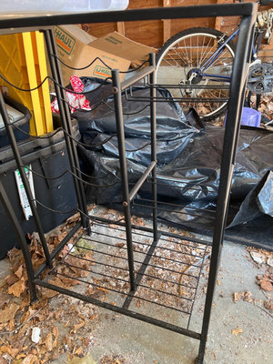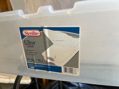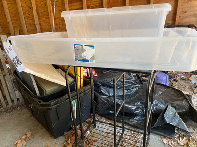 A Sterilite UltraLatch underbed storage box, a large clear plastic storage tub with lid, other opaque plastic storage, and a black metal wire-frame wine rack supporting a glass-top surface. Wine rack. Needs cleaning. Located in garage.