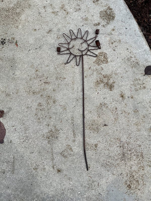 Rusted metal cutout garden stakes depicting a sun with a smiley face, a rooster, a hen, and multiple rabbit silhouettes.