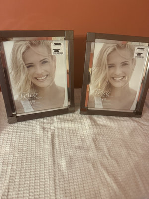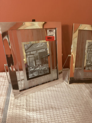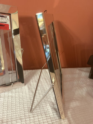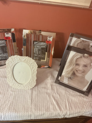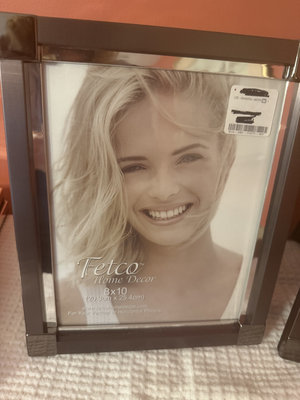 A collection of photo frames including several Fetco Home Decor 8x10 metal frames with mirrored borders and an oval white ornate frame.