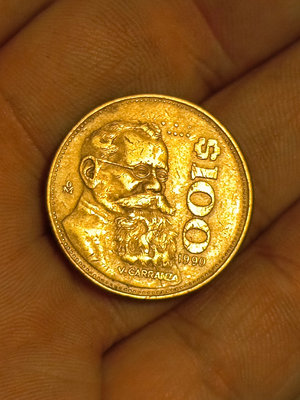 A Mexican 50-pesos coin with Venustiano Carranza on the obverse and the national coat of arms (an eagle perched on a cactus with a snake) on the reverse.