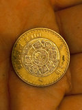 Mexican coins: a bi-metallic coin with a gold outer ring and silver center featuring the national coat of arms (eagle) and the inscription Estados Unidos Mexicanos; and a second coin with an Aztec calendar design around a central motif and Peso inscriptions.