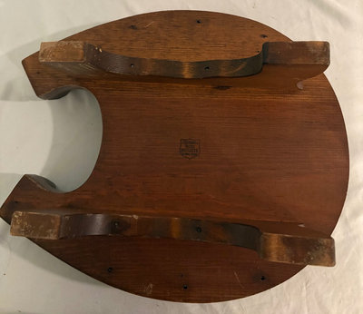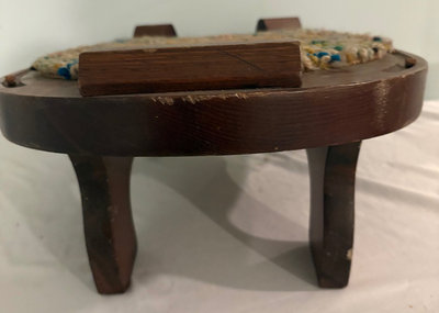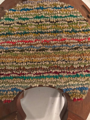 Primitive handmade horseshoe shaped foot stool with colorful hooked wool covering over walnut . 14” x 13”
