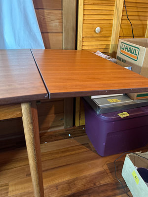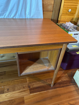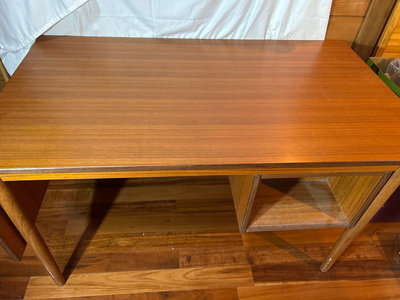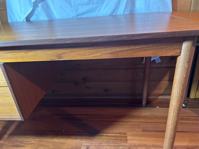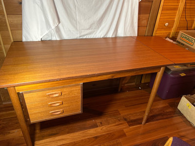 Very unique in that you could have two people sitting on opposite sides. It is 4’ long without the flap extension. 27” deep x 29” high. The flap would add 16”, but it does not have a method in which to hold it up. One side has drawers, The other a shelf. Top is in very good condition. Some white paint splatters on legs. Comes with a box of office supplies.