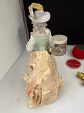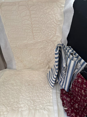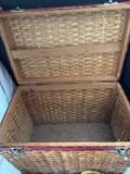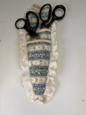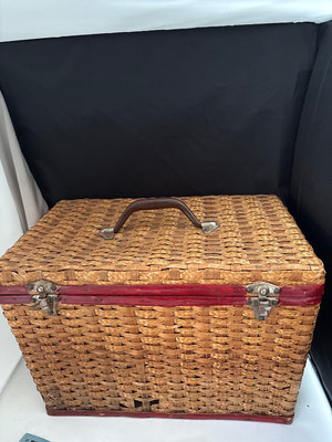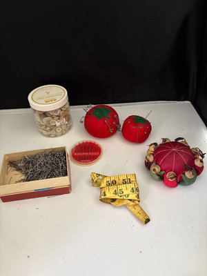 Wicker sewing box, made in mid 20th century , 15” wide, 10” tall, 10” deep, Victorian tassel doll pin cushion , made in Germany, 2 boxes sewing thread, tomato pin cushions, dress pins, Singer needles, tape, vintage buttons , 2 pinking shears , sewing and knitting gauge, rotary wheel, vintage fabric , and 2 half done machine quilting pieces with backing .
