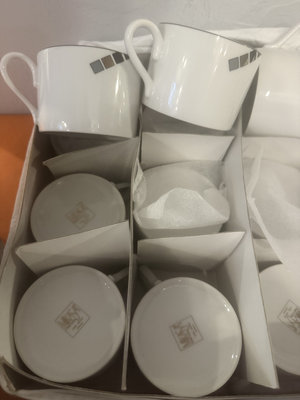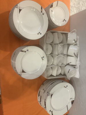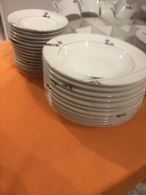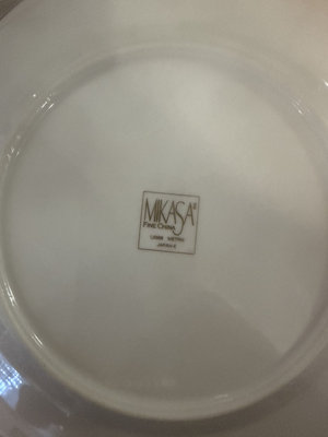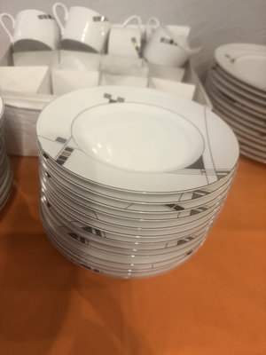 A multi-piece Mikasa fine china dinnerware set in white with a gray geometric motif, including dinner plates, salad plates, bowls, and mugs.