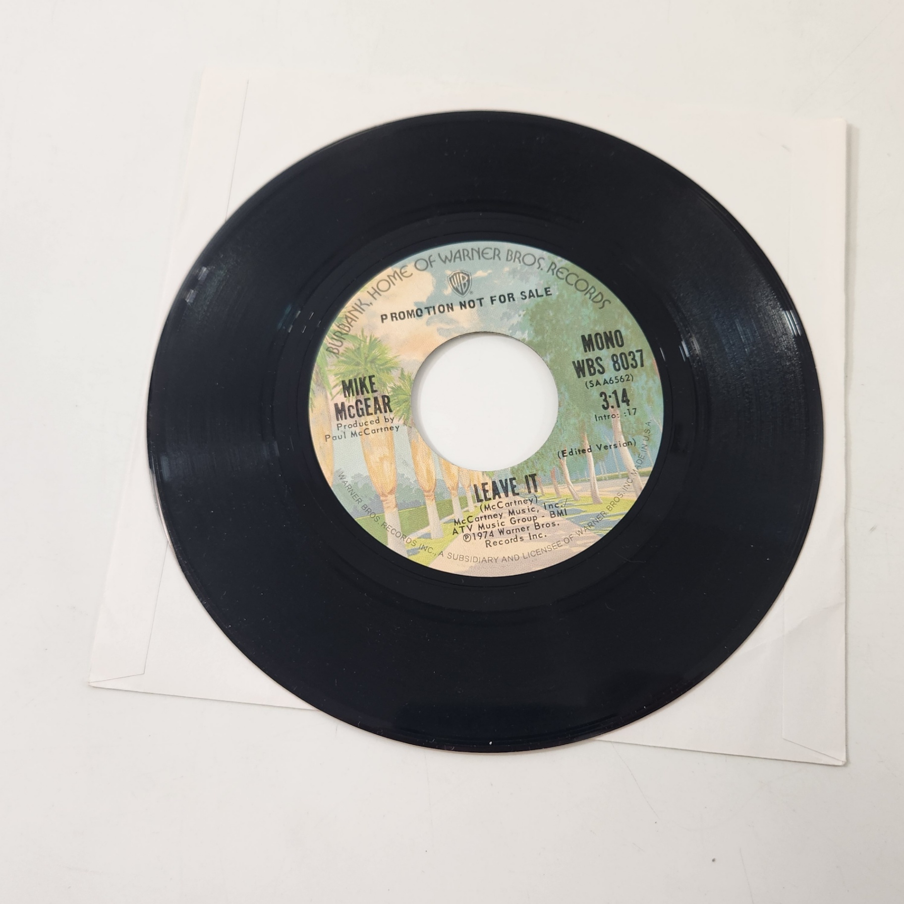 EX 7-inch mono vinyl single labeled 'Leave It' by Mike McGear, produced by Paul McCartney, released by Warner Bros. Records (WBS 8037) in 1974; promotional printing reads 'Promotion Not For Sale'. Local pickup in Vancouver. SHIPPING AVAILABLE ANYWHERE IN CANADA from just $10! Contact [email protected] for quote.