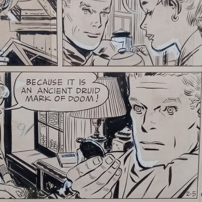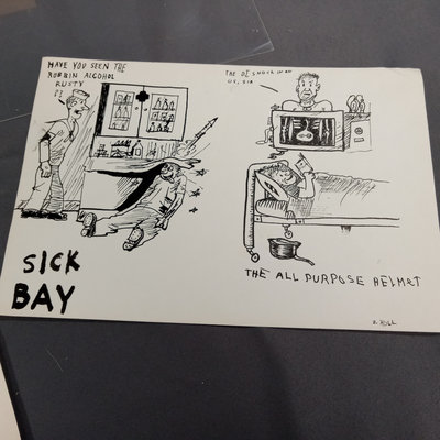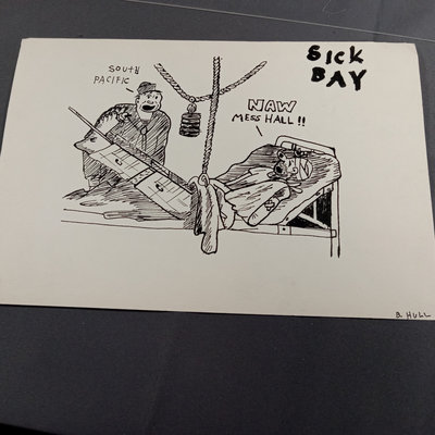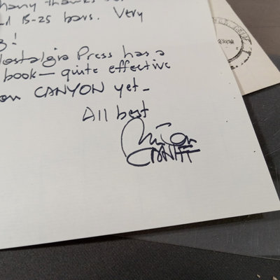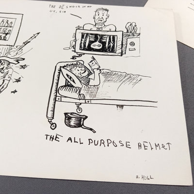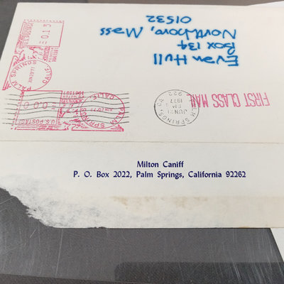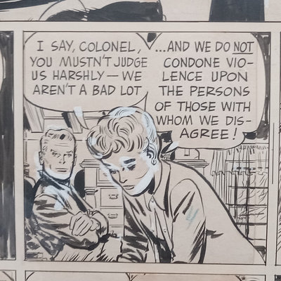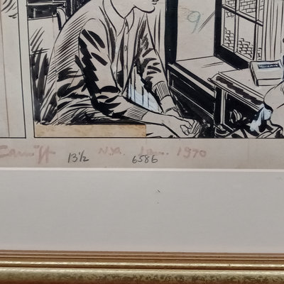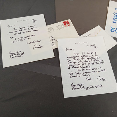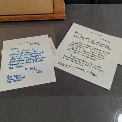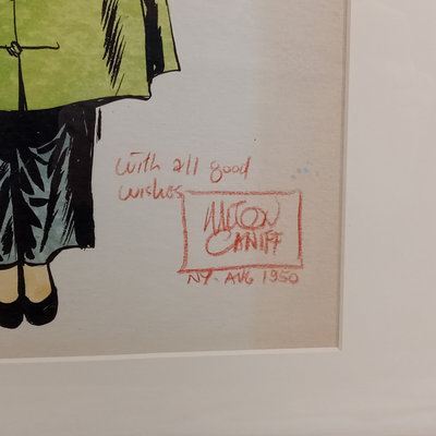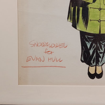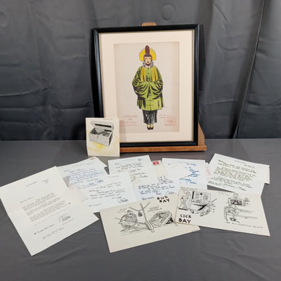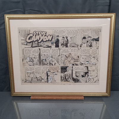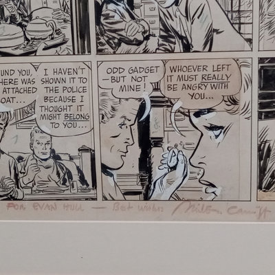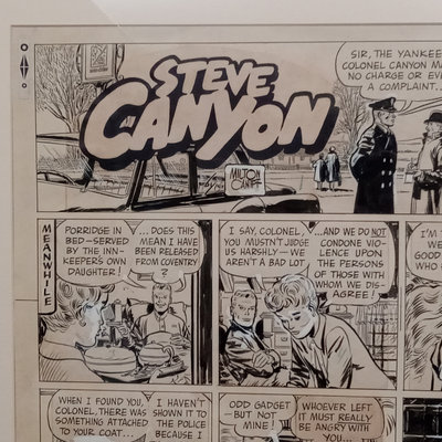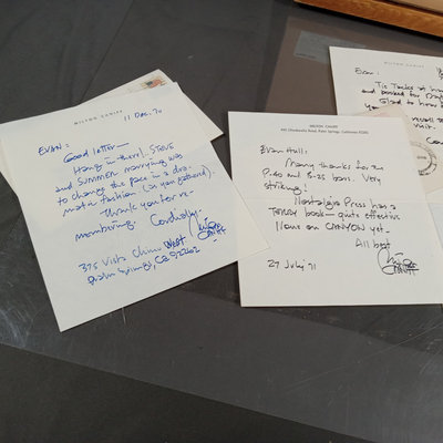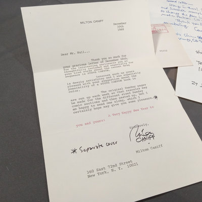 Framed original "Sunflower for Evan Hall" signed by Milton Caniff 1950, dedicated to Evan Hull, 17x14.25 framed. Original framed Steve Canyon comic strip, dedicated to Evan Hull, signed by Milton Caniff, 1970, 24x30 framed. Correspondence between Milton Caniff (American Illustrator, 1907-1988), and Evan Hull (American, 1931 - 2014) spanning 1950s-1980s, with illustrations by Evan, including one about the "All Purpose Helmet," an allusion to "A Helmut for My Pillow" by Robert Leckie. 5 plus pieces.