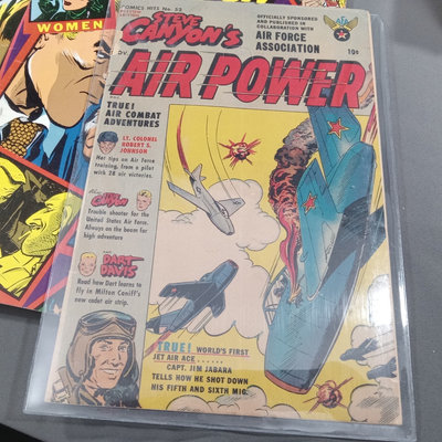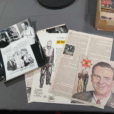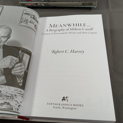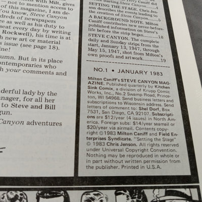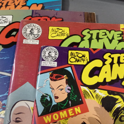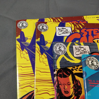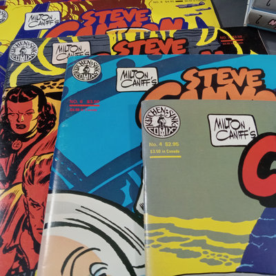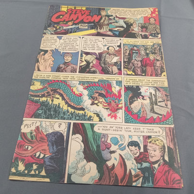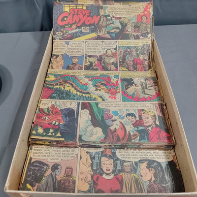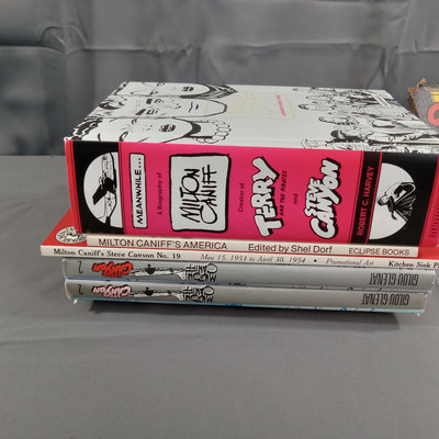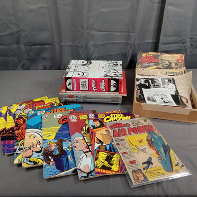 Milton Caniff (American Illustrator, 1907-1988). "Steve Canyon" newsstand comic book, undated, plus box of color comic strips from the 1950s cut directly from the newspaper. Collected works in softcover along with soft color volumes of the strip from the 1980s. Biography of Milton Caniff Robert C. Harvey and more. Several duplicates. 13 plus pieces.