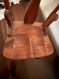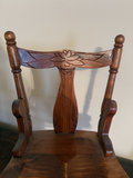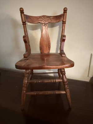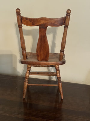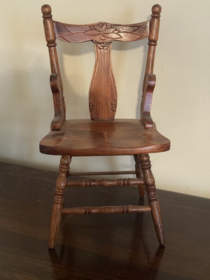 A small carved wooden chair with a pressed-back splat featuring a leaf motif, turned legs with stretchers, curved seat, and side arm supports; doll-sized.