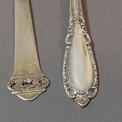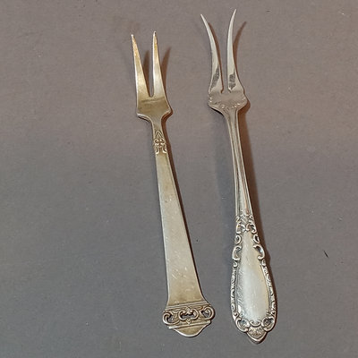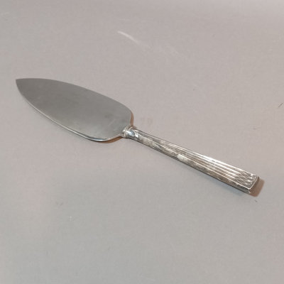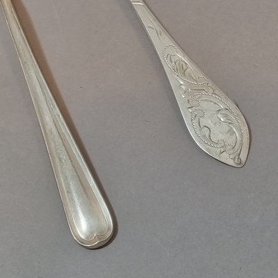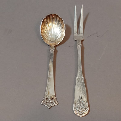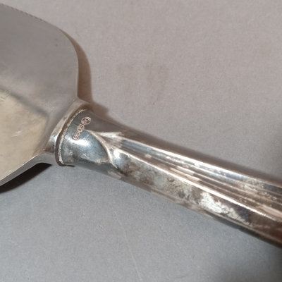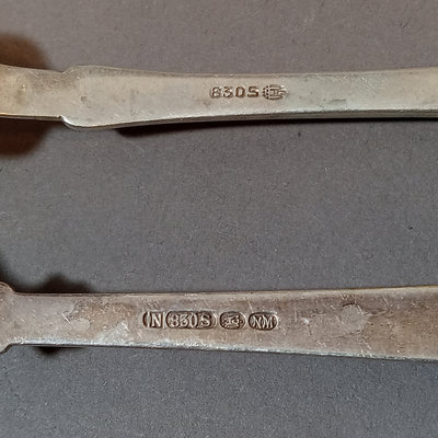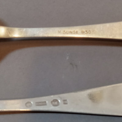 Scandinavian flatware, marked 830 S. Pie server, handle only 830S. Includes M. Sunde serving spoon, A.J. dinner spoon and fork, Jacob Tostrup teaspoon, NM dinner spoon, soup spoon, and forks. Overall 186.4dwt (excludes pie server). 11 pieces.
