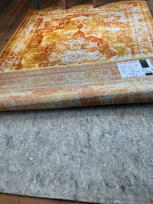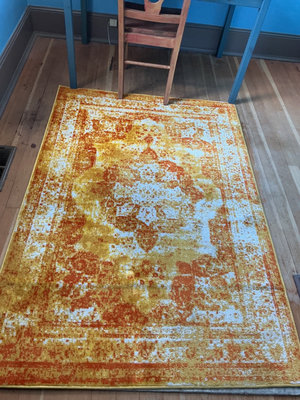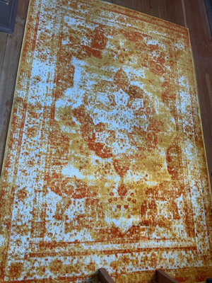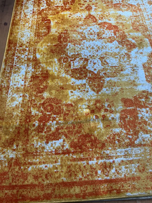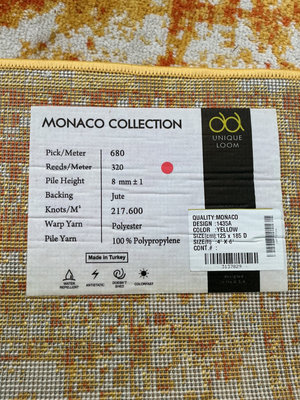 Monaco Collection area rug in a yellow and orange distressed pattern. The label shows size 4’ x 6’, color yellow, pile height 8 mm ± 1, backing is jute, pile yarn 100% polypropylene, warp yarn polyester, and it is made in Turkey.