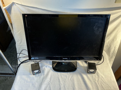 24” ViewSonic monitor, full-size keyboard, two mice and trackball, and two small desktop speakers.