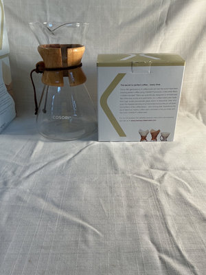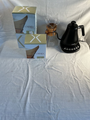 Cosori glass carafe with a wooden collar, and an Cosori electric kettle with a control panel, tested and over 200 Chemex filters new in box.