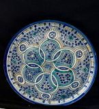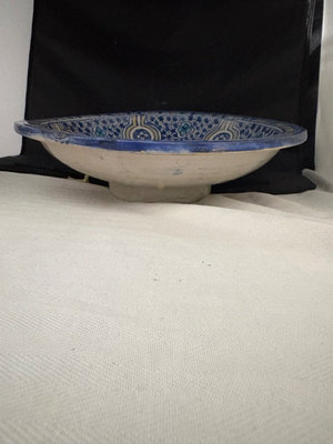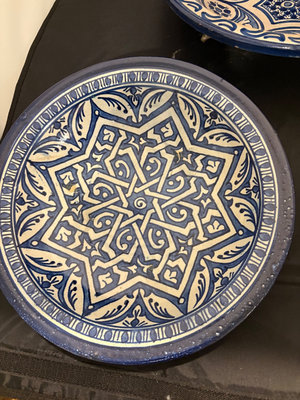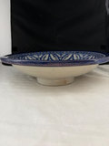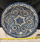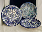 From the city of Fez or Safi beautiful ceramic bowls in a Moorish pattern , blue and white. Can be used for serving or as a wall hanging . They are 3 sizes , 11” diameter, 13” and 14” They are 3 “ tall shallow bowls
