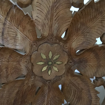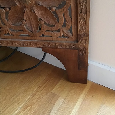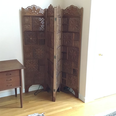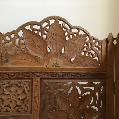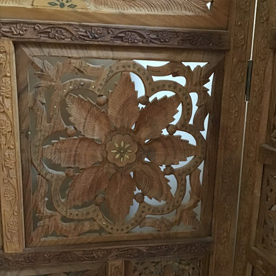 Intricately carved wood 4-panel screen with mother of pearl inlay and flower patterned design. 74x.75x68. Heavy, bring help and appropriate vehicle to pickup. 1 piece.
