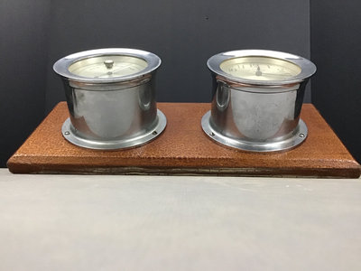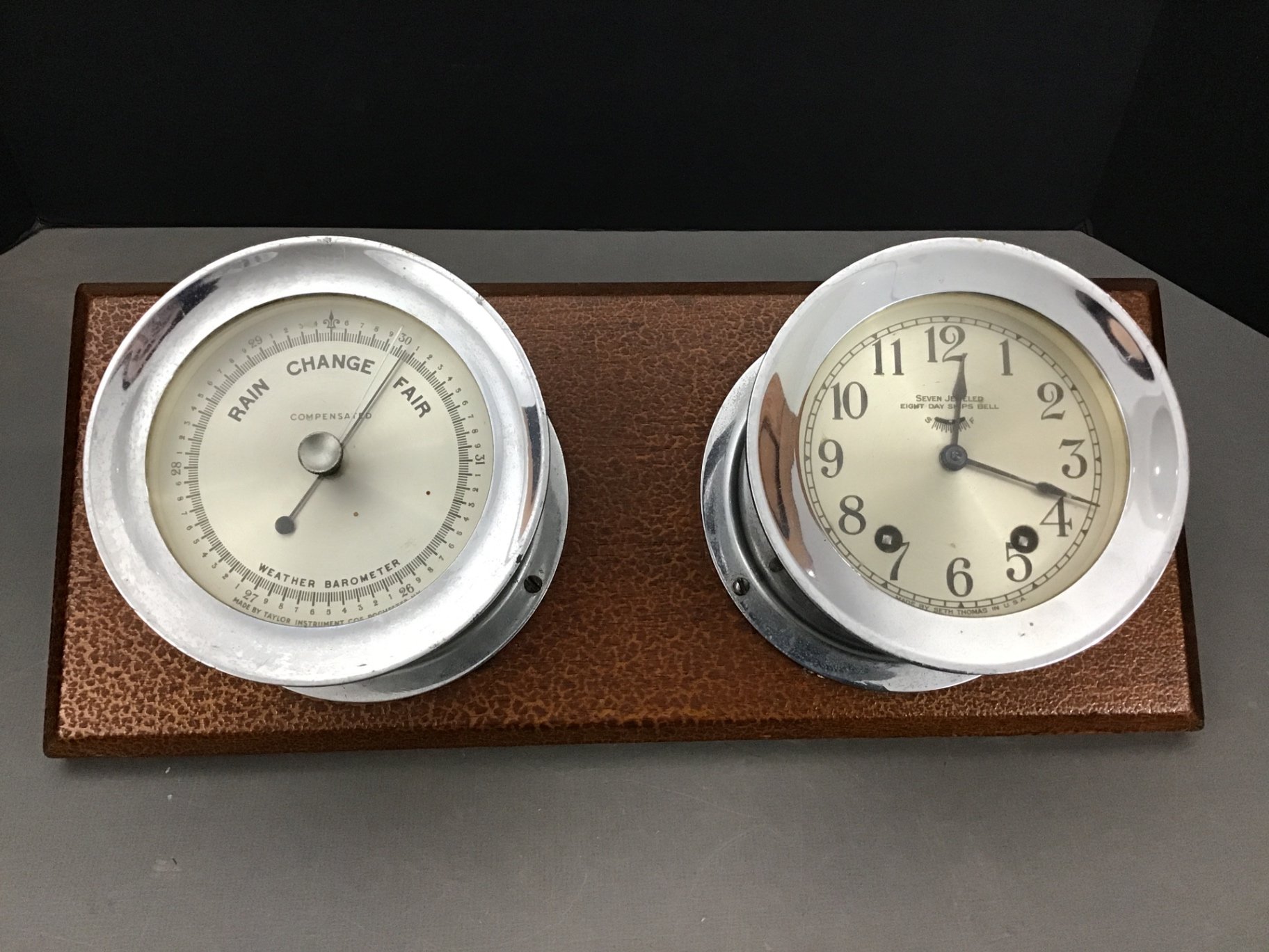 Seth Thomas clock and Taylor Instrument Co. compensated barometer, maritime / ship's clock cases, mounted on wood, crackling on the shellac present. 17x7x4.5. 1 piece.