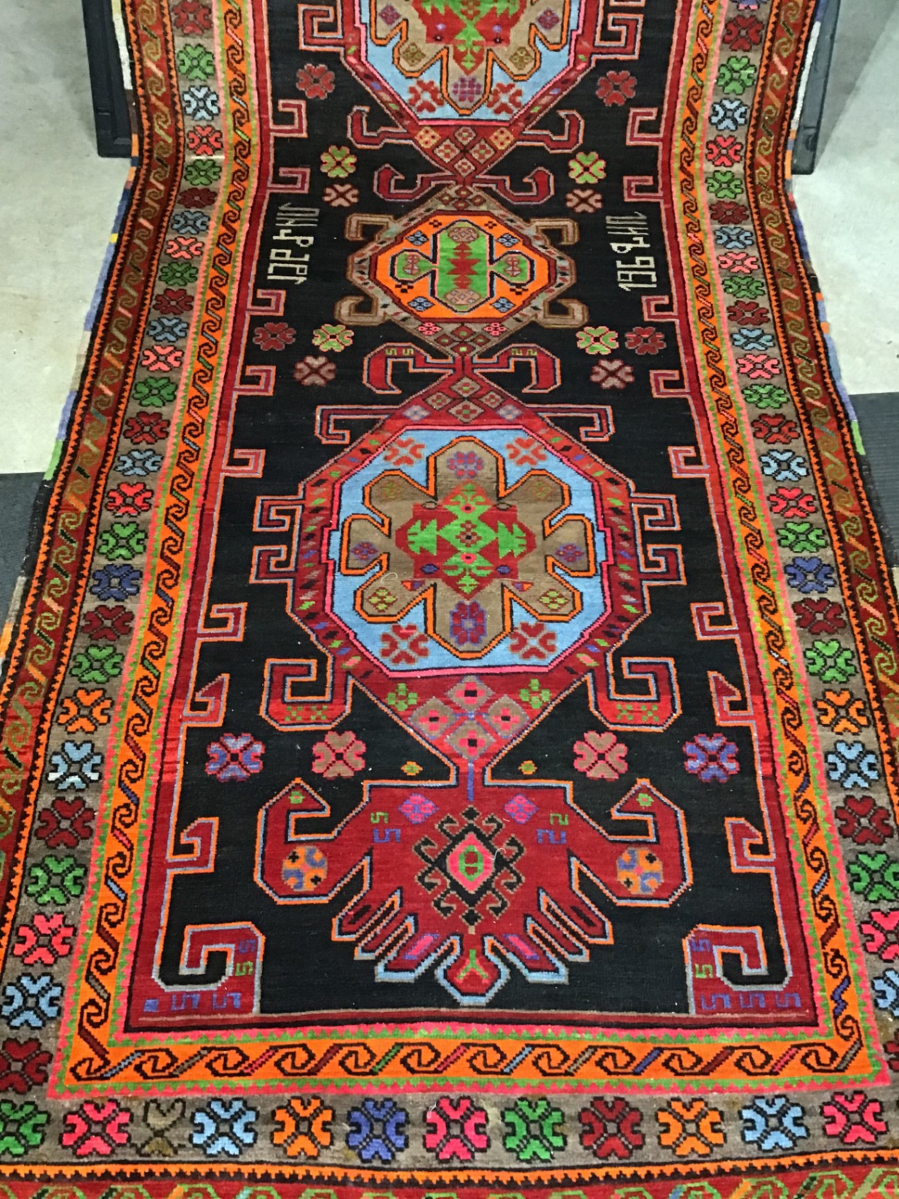 Handmade wool carpet. Multi-colored with vivid center. Needs cleaning. 51x122. 1 piece.