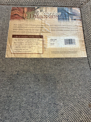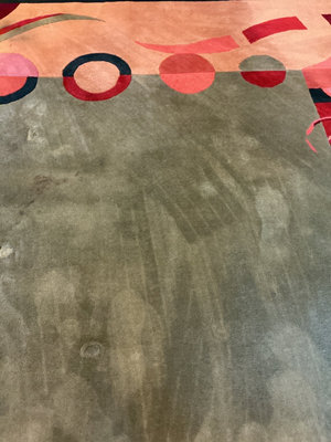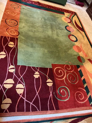 A large wool area rug with an abstract, geometric pattern in green, coral, red, yellow, and teal tones; bordered designs and circular motifs. Large rug measurements are 95 x 131. Runner dimensions are on label at 2'3" x 8'.