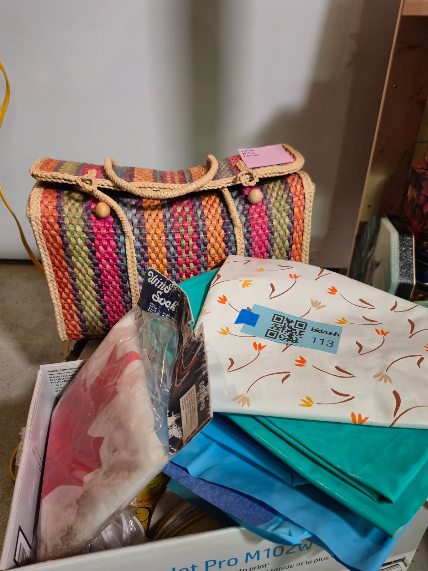 A mixed collection consisting of a bright multicolored woven handbag, a stack of paper/plastic plates, table coverings, and various plastic bags and packaging materials.