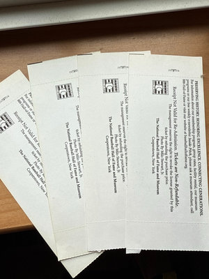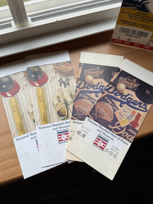 A collection of National Baseball Hall of Fame and Museum memorabilia including World Series game tickets, promotional cards, and baseball-themed imagery with team logos (Dodgers, Yankees, Red Sox).