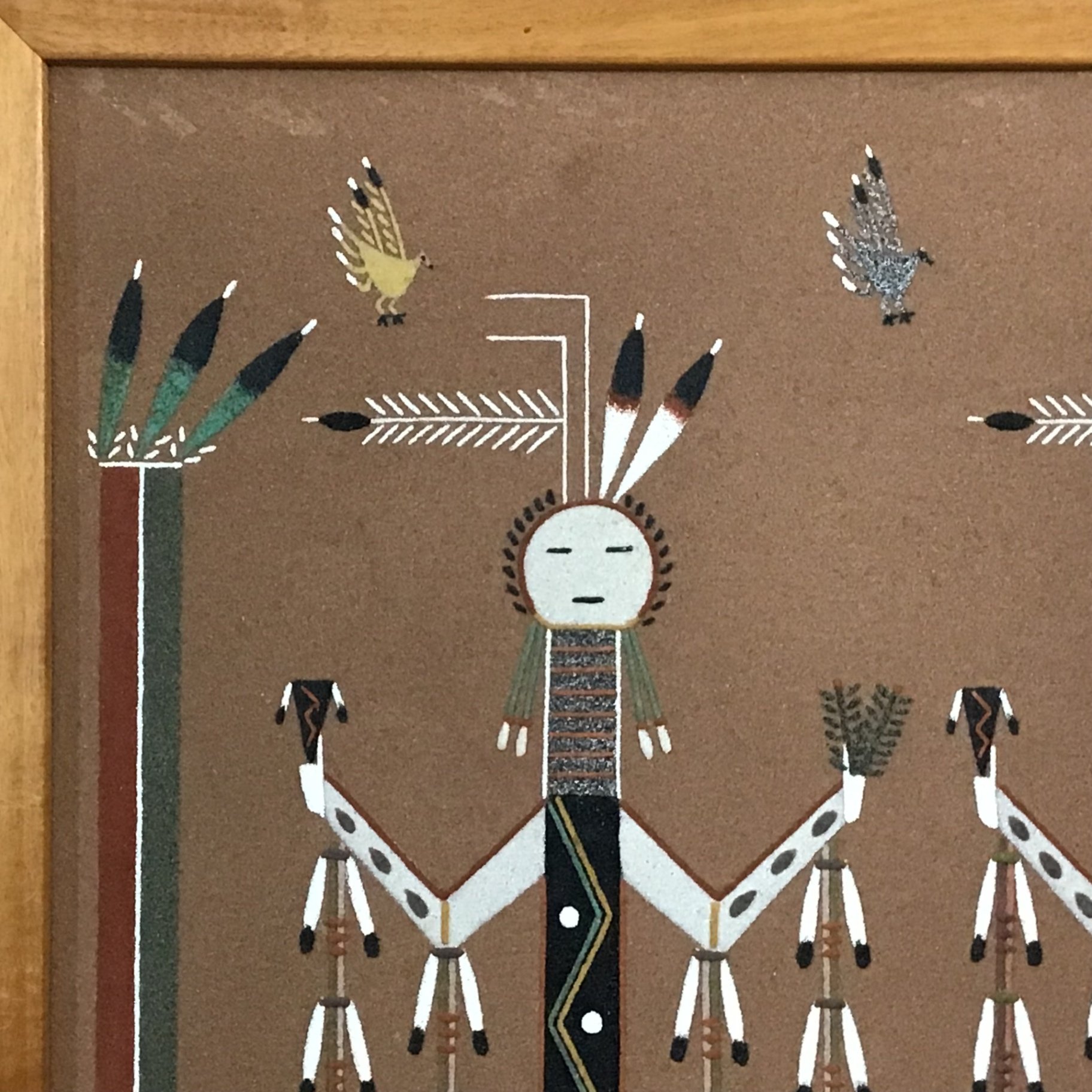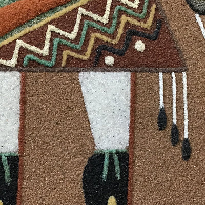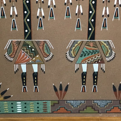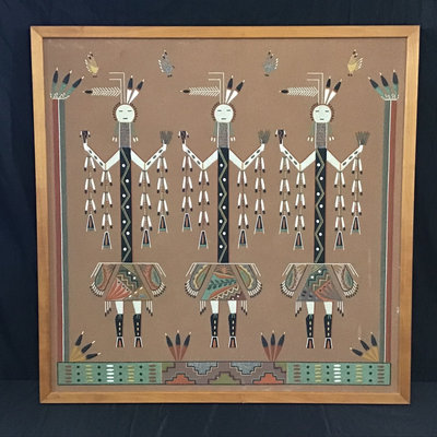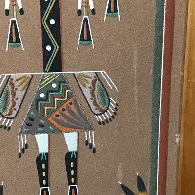 Navajo sand painting "Yei Bi Chai" by Nelson Lewis (Navajo, ? - 2022), Arizona. Information written on the back of the painting, under the frame's paper backing: "Ye Bi Chai" This is a Navajo religious ceremonial sandpainting design. This painting is made out of natural colored sandstones. Nelson Lewis / Star Route Bx #462 / Winslow, Arizona / 86047." Wood frame, 25.25sq. 1 piece.