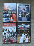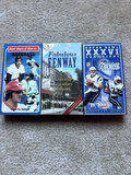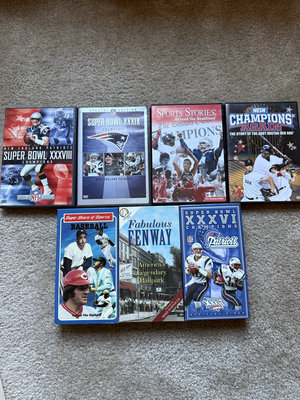 A multi-item collection of sports-themed video media in DVD and VHS formats, including Patriots Super Bowl champions titles, Boston-area sports stories, and Fenway Park/baseball titles.