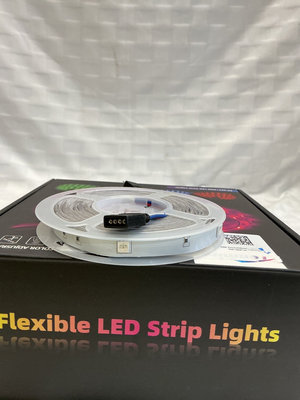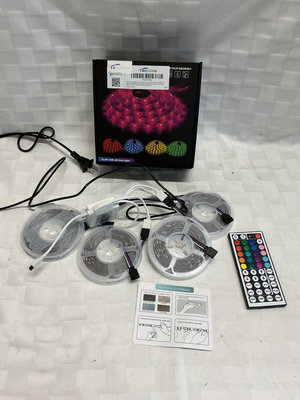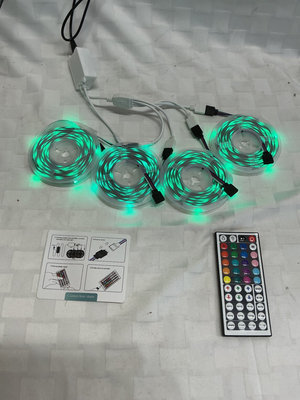 A multi-reel flexible LED strip light kit with four reels, a power adapter, connectors, a color/brightness remote, and an installation guide. Tested