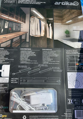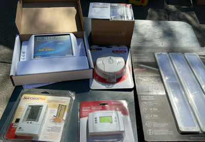 Includes two new in box smoke alarms, a package of 3 under cabinet light kits, a thermostats, a floor thermostat and a water conditioner.