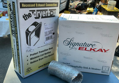 The Dryerbox is a recessed Exhaust connection for the back of a dryer to minimize lint and protect hose. And a stainless Steel Deep Sink & Strainer.