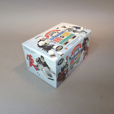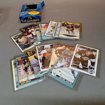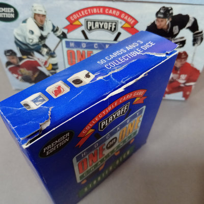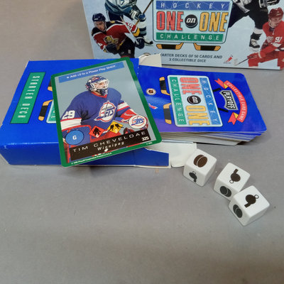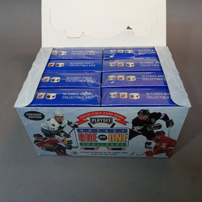 Hockey Collectible Card Game, One on One Challenge box with 8 packages - one deck open, others are sealed. Box with 15 top loader plastic sleeves, mixed bag of cards. 2 boxes.