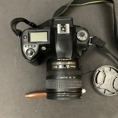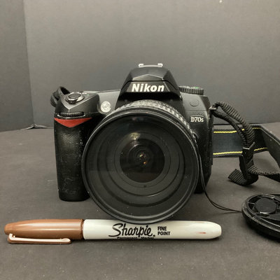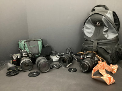 Nikon D3000 digital camera with Nikon DX AF-S Nikkor 18-55mm 1:3.5-5.6G lens and attached Promaster 52mm UV filter and fabric strap, has battery and charger, incluing SanDisk Ultra 32GB card, comes in a Tamrac camera bag/backpack with chargers, cables, and more, tested and working condition for shutter and photo capture, other features not tested. Additional Promaster EDO AF-S LD 70-300mm 1:4-5.8 Tele-Macro lens with Promaster 62mm Skylight 1A filter attached, untested. Nikon D70S body, sticky grips, with Nikon DX AF-S Nikkor 18-70mm 1:3.5-4.5G ED lens and a Promaster 67 mm UV filter, all untested, comes in a green Quantaray bag. Nikon DX AF-S 18-200mm 1:3.5-5.6GII ED lens with attached Luminesque 72MM UV filter, untested. 8 plus pieces.
