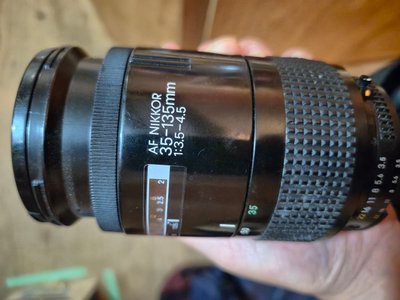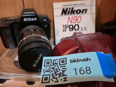 Nikon F90 film SLR camera body with an AF NIKKOR 35-135mm f/3.5-4.5 lens attached; the camera back is open showing the interior mount; includes a Nikon instruction manual. UNTEST, as is as found. ** BRING OWN PACKING MATERIALS