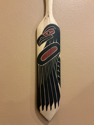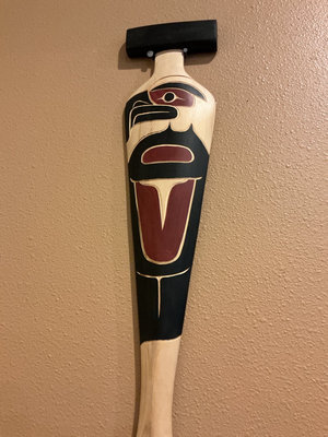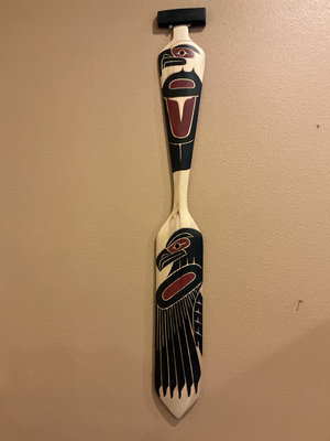 A tall carved wooden paddle featuring black, red, and cream Northwest Coast-style raven motifs with geometric patterns. The piece has handwritten title ‘Eagle and Raven’ David Louis 2022. It is 48 inches tall and 6 inches wide.