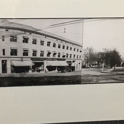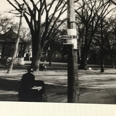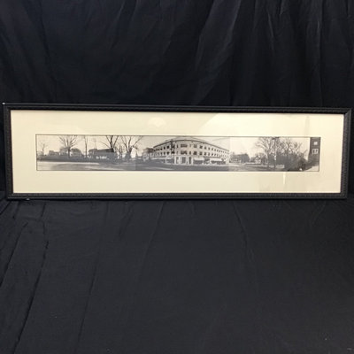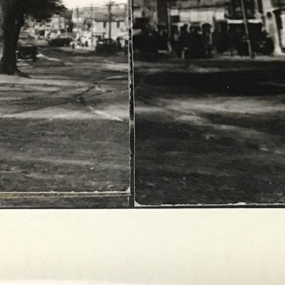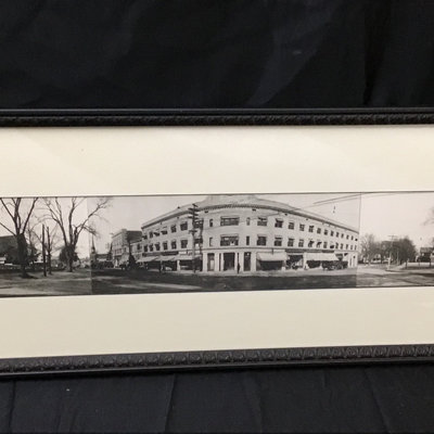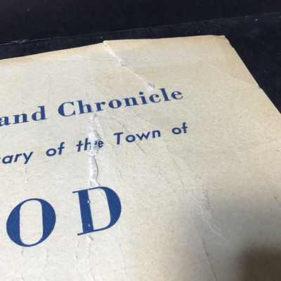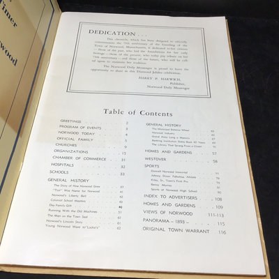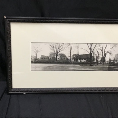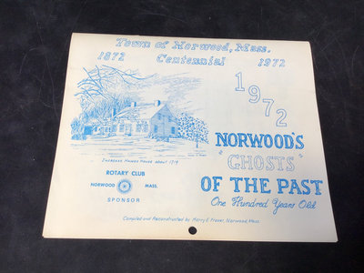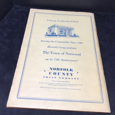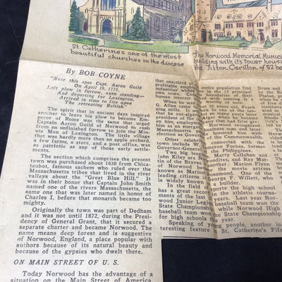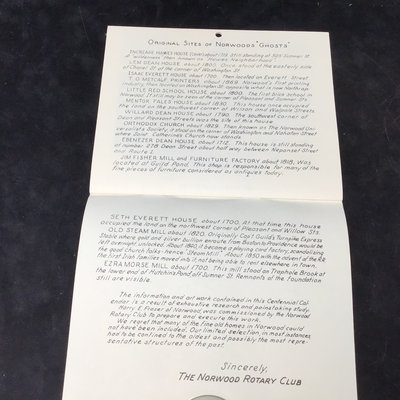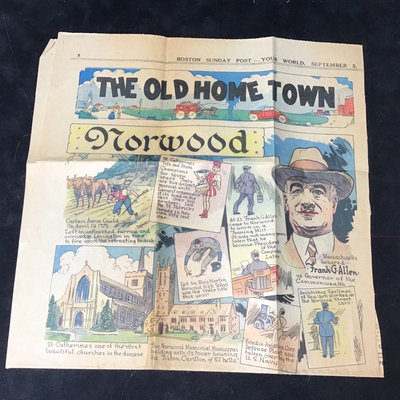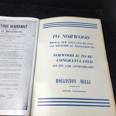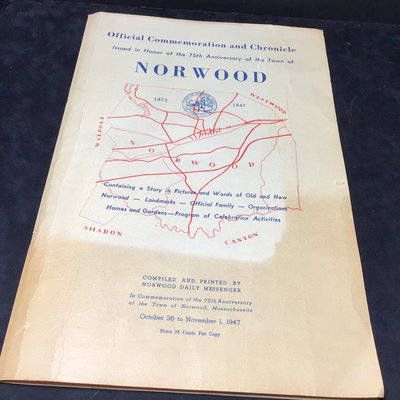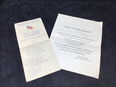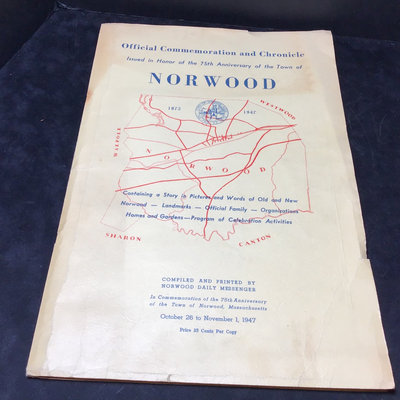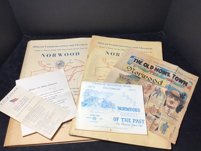 Framed antique "panorama" matted trio of photos, Norwood MA of Walpole, Washington, and Guild Streets, unknown photographer or year, 8.5x35 frame. Norwood newspaper clipping from 1943, wall calendar from 1972, 1947 Commemorative Chronicle, 1919 Soldiers Celebration invitation and programme. 7 pieces.