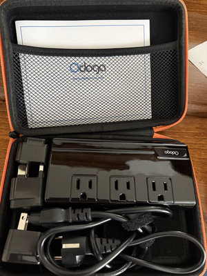 Travel power converter with a multi-outlet power strip and accompanying accessories stored in a black and orange zipper case; includes user manual in a mesh pocket.