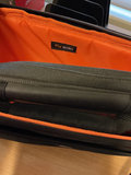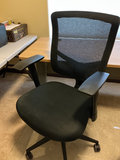 A laminate topped desk and a black ergonomic swivel chair are accompanied by multiple black file organizers, a black carrying bag with an orange interior by Solo, and a boxed table magnifier. Top has some discoloration and there are some areas of damage, good for a work shop space vs office. Dimensions are 60 inches wide 27 inches deep and 29 inches tall. Includes thick plastic floor covering.
