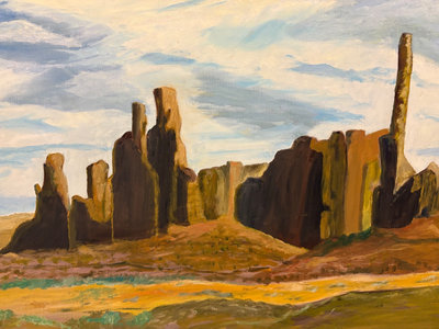 This painting is of Monument Valley, a desert region on the Utah-Arizona border, known for its towering buttes and mesas. It is part of the Navajo Nation which is culturally and spiritually significant to the Navajo people. It is 31.5” wide and 26” tall, signed D.Stearns