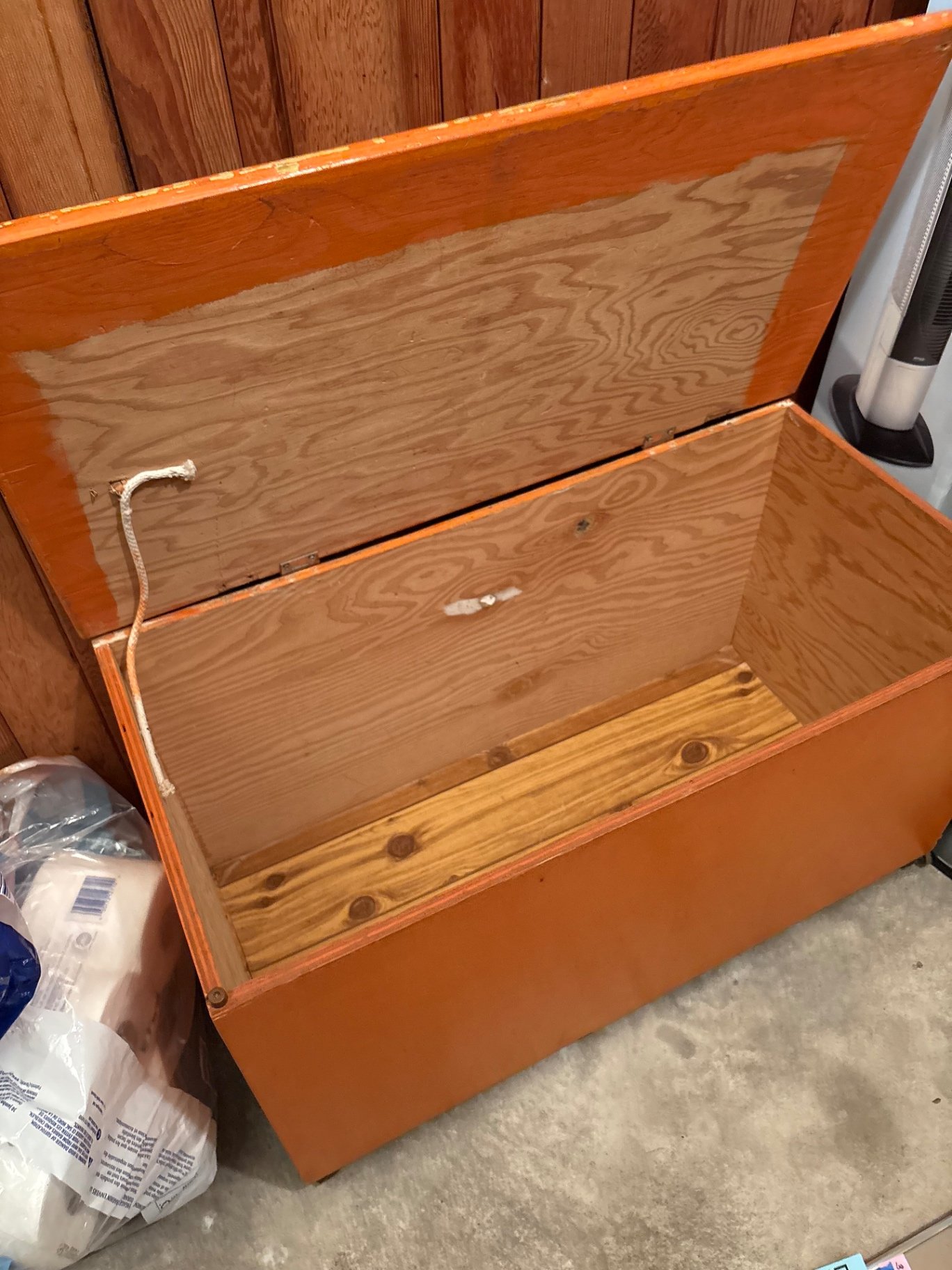 A rectangular orange-painted wooden storage chest with a hinged lid and worn, natural wood interior. The lid is attached with a hinge and an interior edge features a rope pull. Condition: has some marks and scratches. 31.75 x 15.75 x 19 Note: Heavy item, please bring appropriate assistance as needed to move this item from basement.