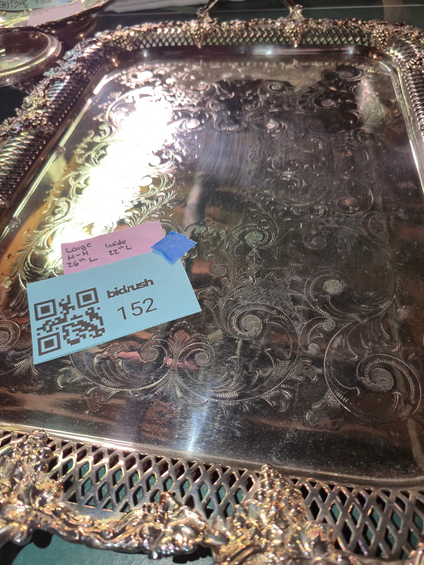 An ornate silver plated serving tray with intricate embossed scrollwork and floral patterns on its surface, accompanied by a folded brown polishing cloth.