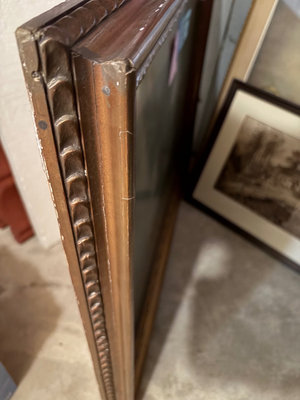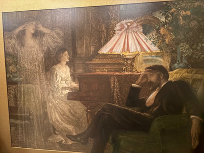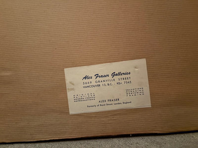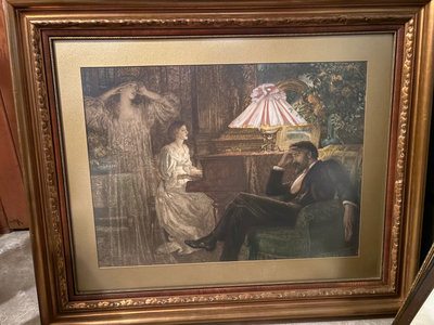 A large framed artwork with an ornate carved wooden frame, depicting a man and a woman in a classical interior around a piano with a decorative lamp; the back shows a hanging wire. A gallery label from Alex Fraser Galleries is attached Dimensions: 27.5" W x 22" H