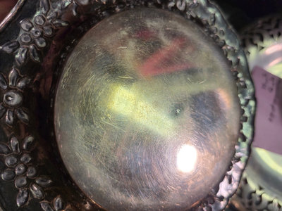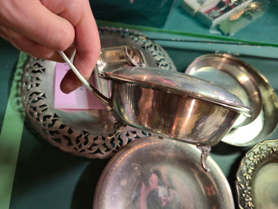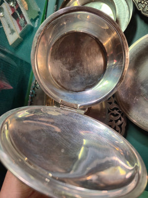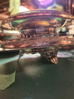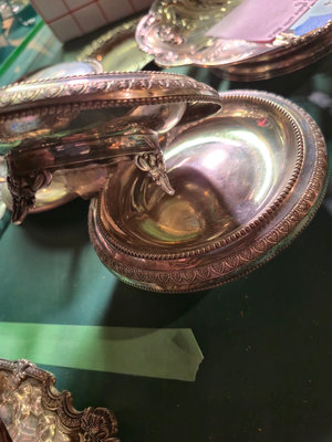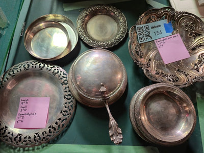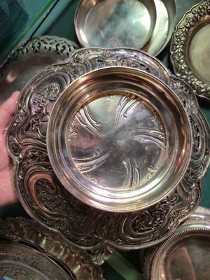 A collection of ornate, silver-plated serving pieces consisting of several engraved bowls, a lidded vessel with a hinged handle, and round plates with decorative borders, all showing intricate patterns and varying sizes. ** BRING OWN PACKING MATERIALS