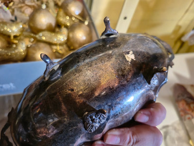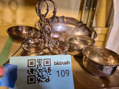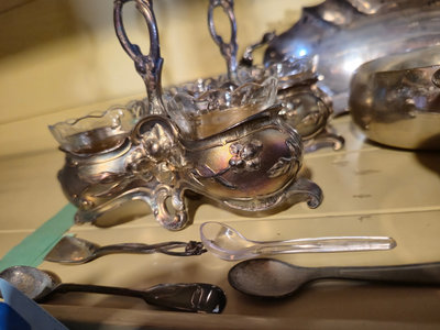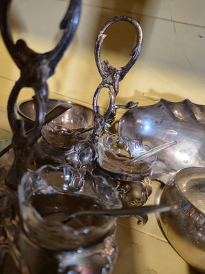 A collection of silverplate serving pieces featuring an ornate multi-bowl cruet stand, scalloped bowls, and various spoons, along with a decorative vase-like vessel; all pieces share floral and scroll motifs. **BRING OWN PACKING MATERIALS