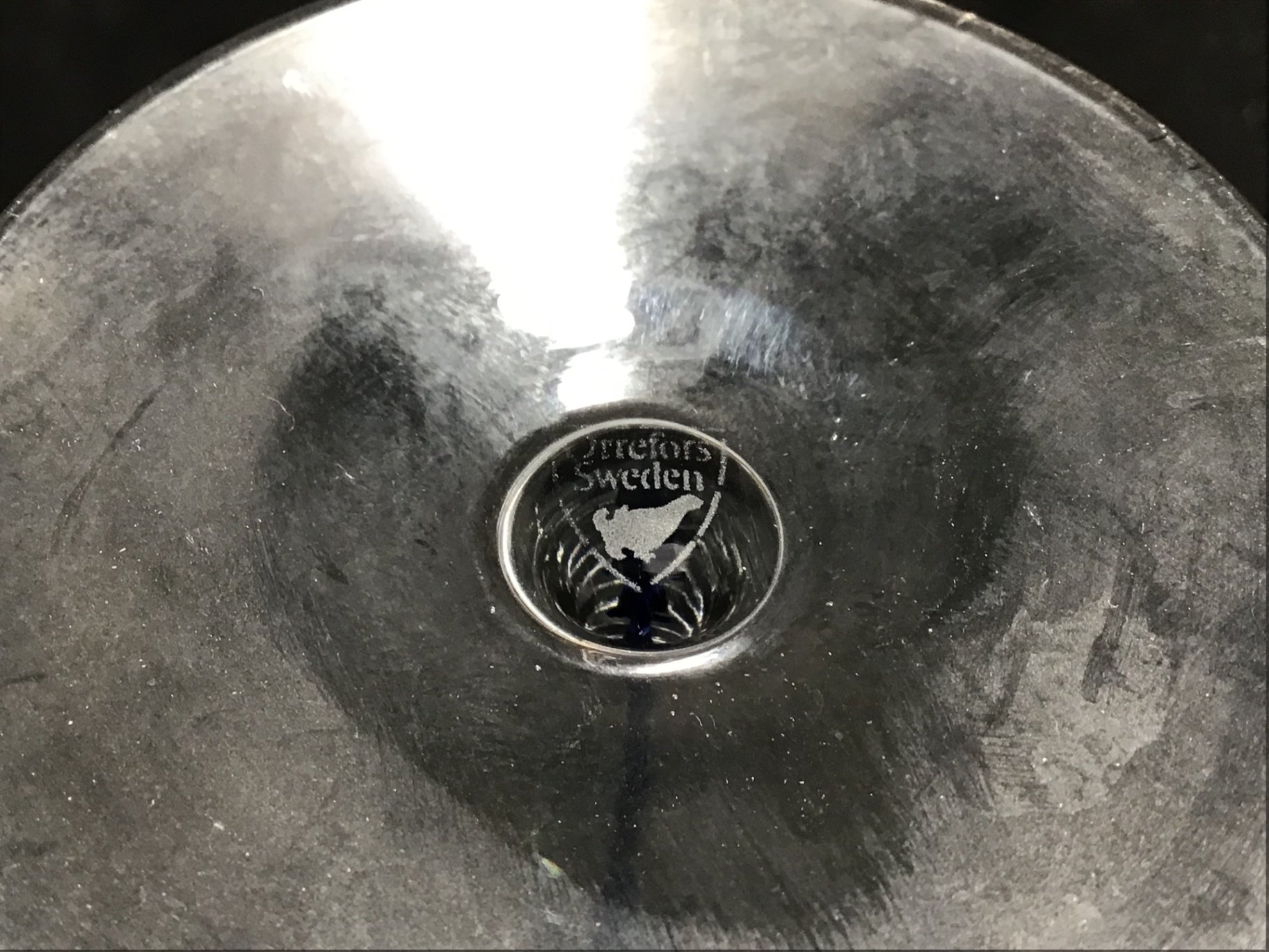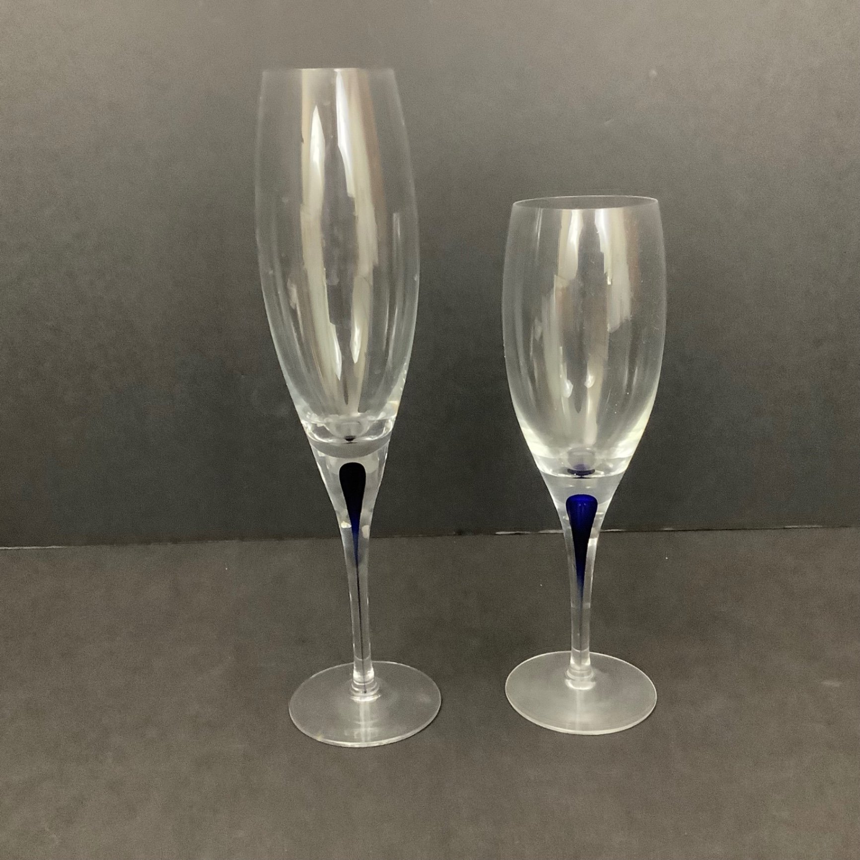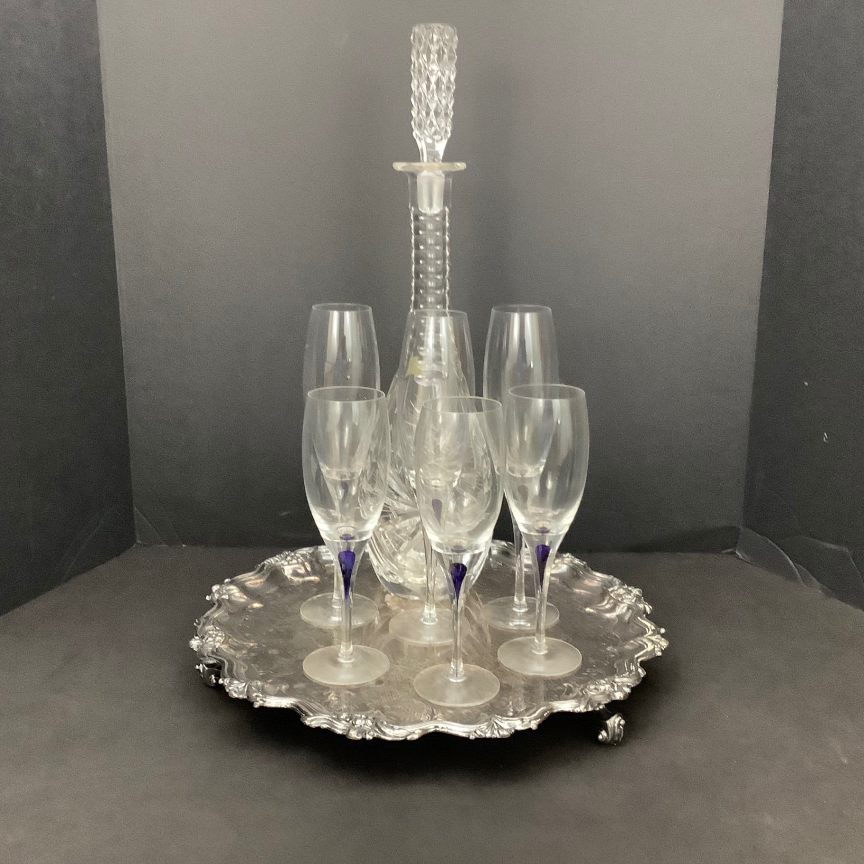 Orrefors Intermezzo Blue clear glasses with blue drop in stem, white wine glasses 8h (3) and champagne flutes 9.75h (3), made in Sweden. Beyer crystal decanter, 18h, made in West Germany. Footed silver plate tray, no makers mark, 14d. 8 pieces.