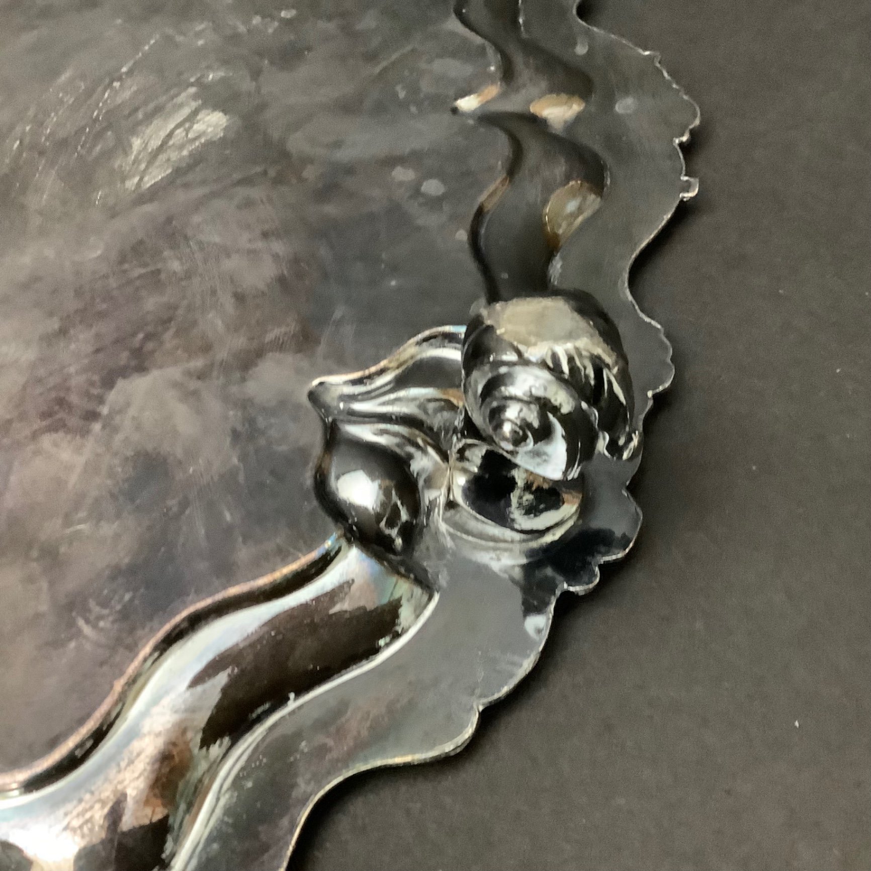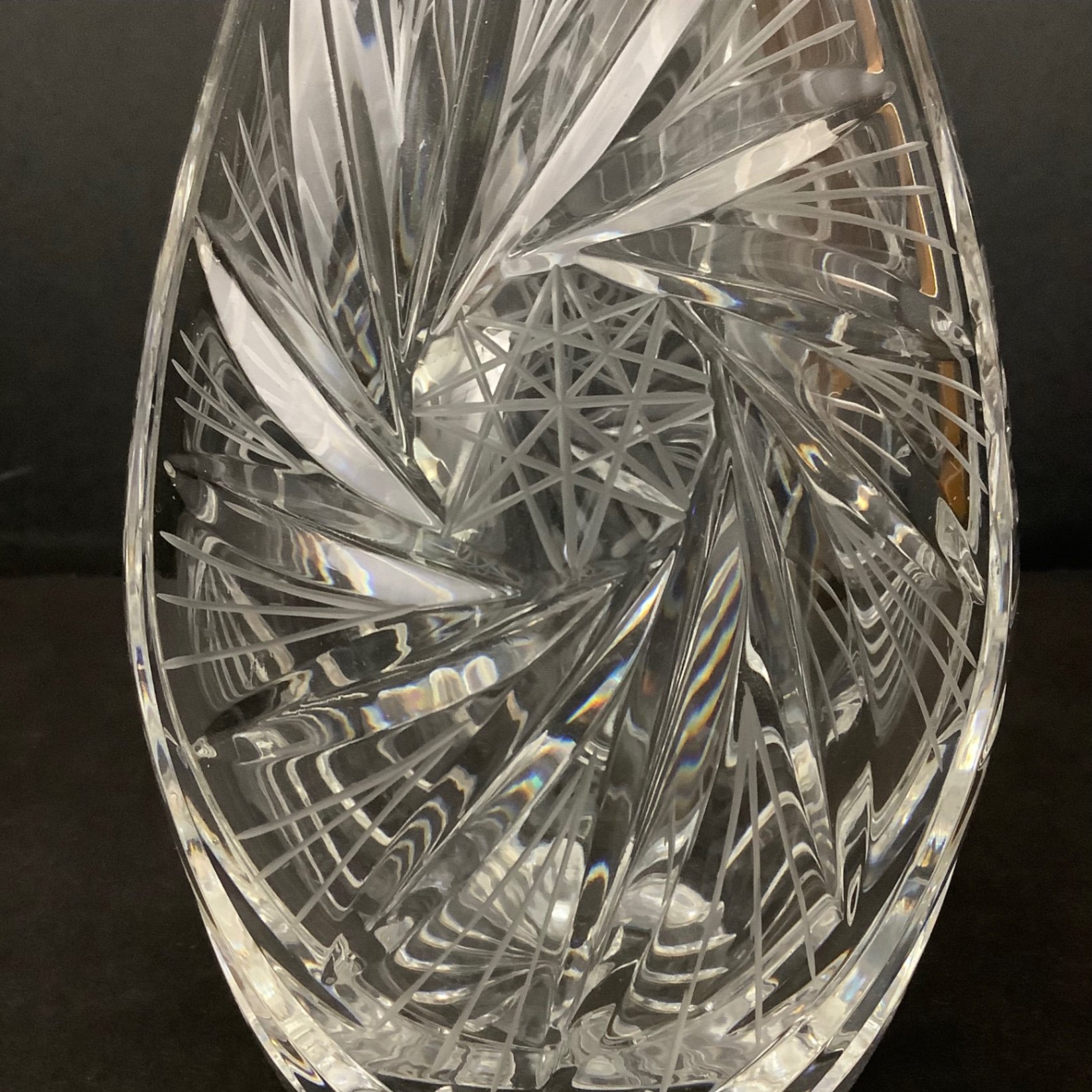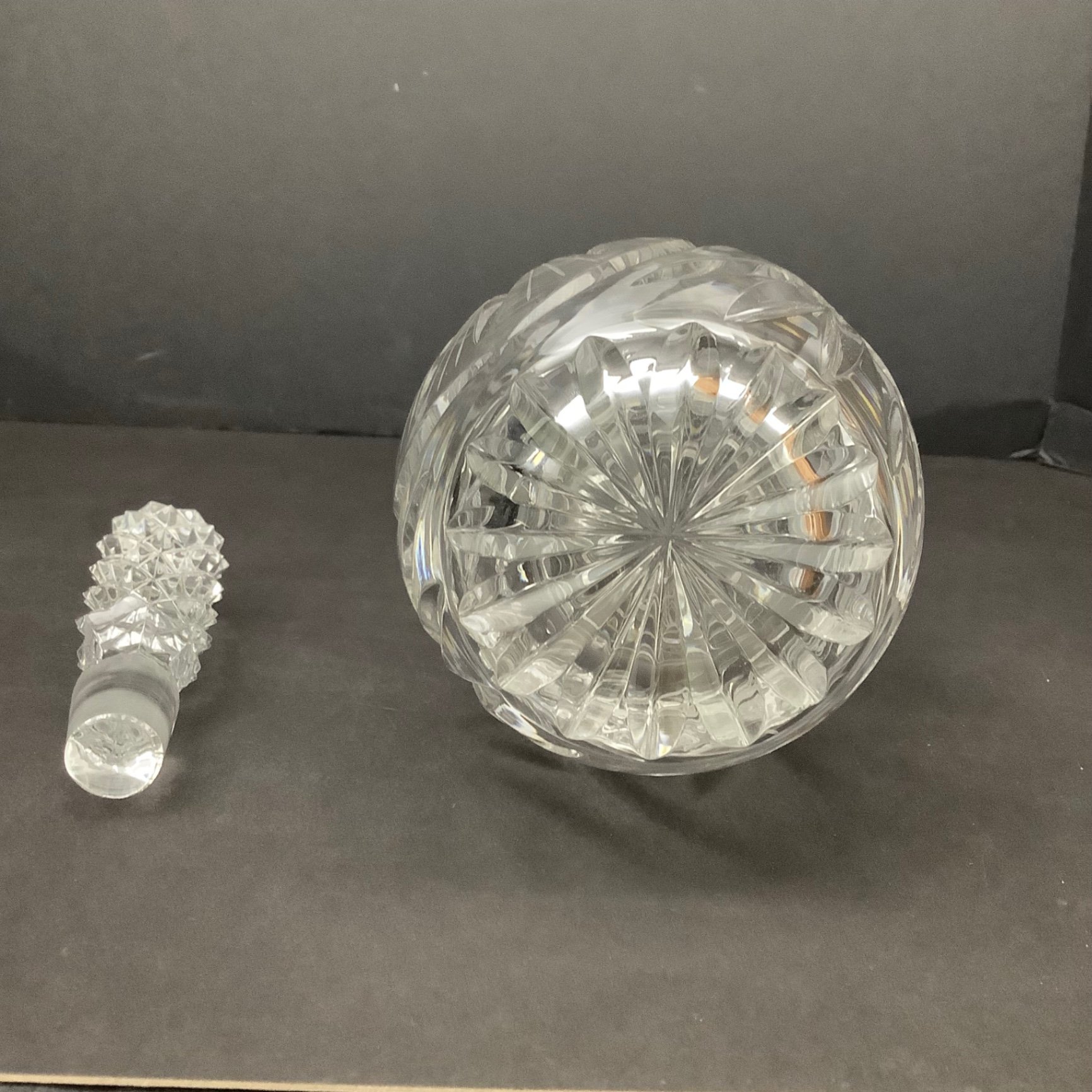 Orrefors Intermezzo Blue clear glasses with blue drop in stem, white wine glasses 8h (3) and champagne flutes 9.75h (3), made in Sweden. Beyer crystal decanter, 18h, made in West Germany. Footed silver plate tray, no makers mark, 14d. 8 pieces.