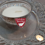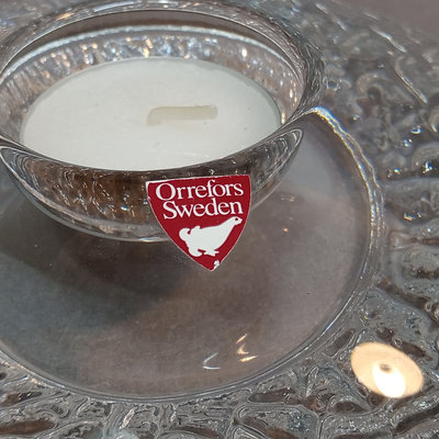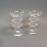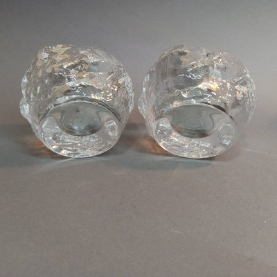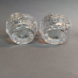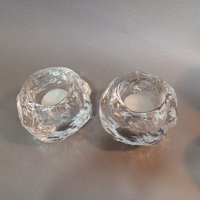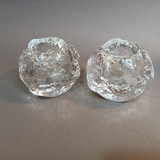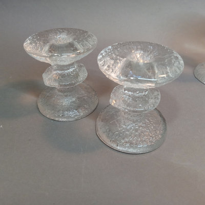 Orrefors Discus Votive, designed by Lars Hellsten, made in Sweden, 5.5d x 1.5h. Kosta Boda Crystal Snowball votive pair, designed by Ann Wolff, 2.75h. iittala Festivo 1 Ring and 2 Ring candle holders, designed by Timo Sarpaneva, 2.75h and 4.75h. 7 pieces.