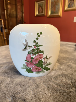 A glossy white porcelain pillow vase featuring a hand-painted design of pink flowers and two hummingbirds. It has a smooth rounded form with a small top opening and a gold trim around the inner rim. A base label identifies the piece as the Hummingbird Pillow Vase with approximate dimensions of 6.5 inches in height, 3.75 inches in diameter, and a 1.25 inch top opening.