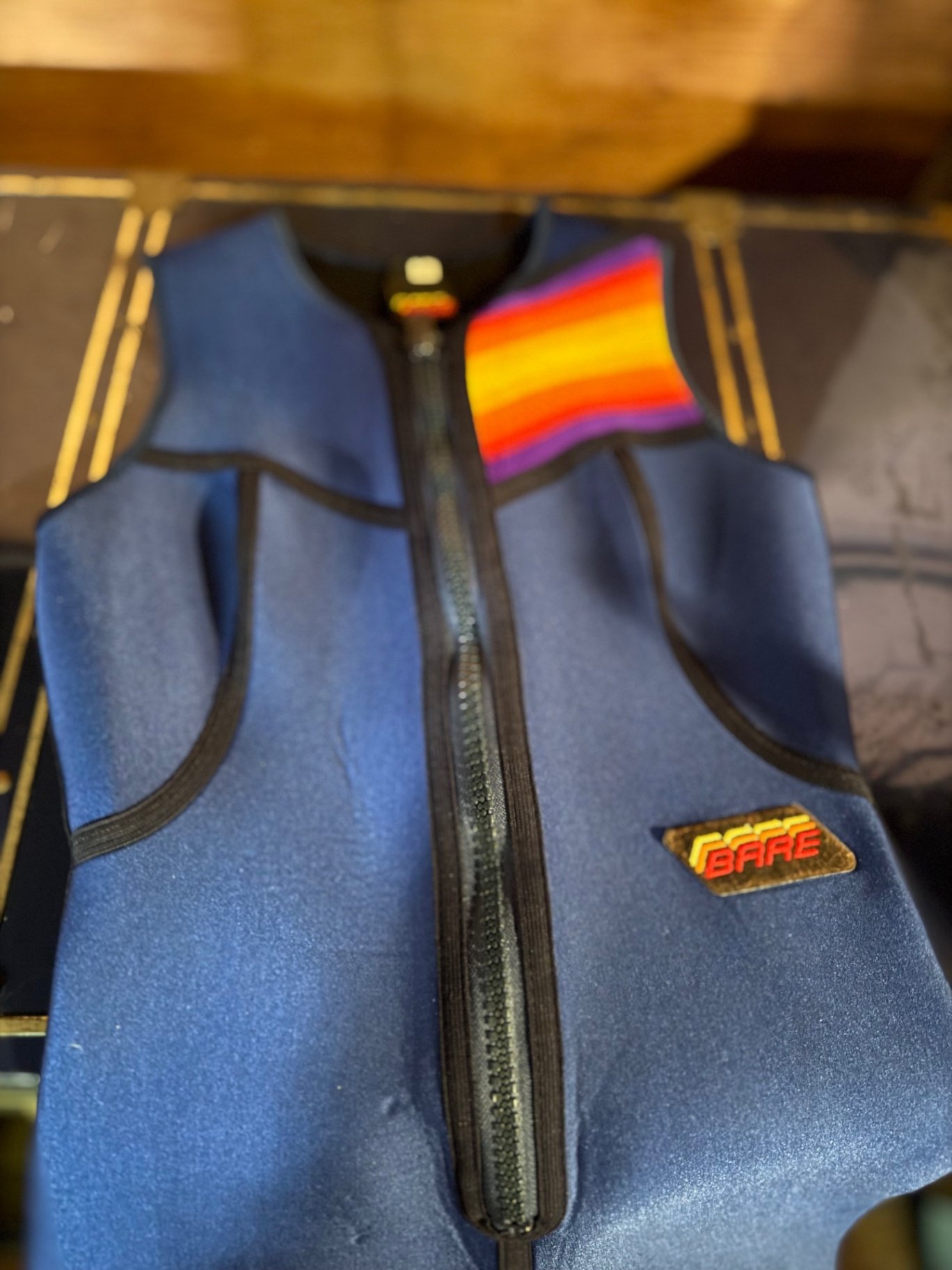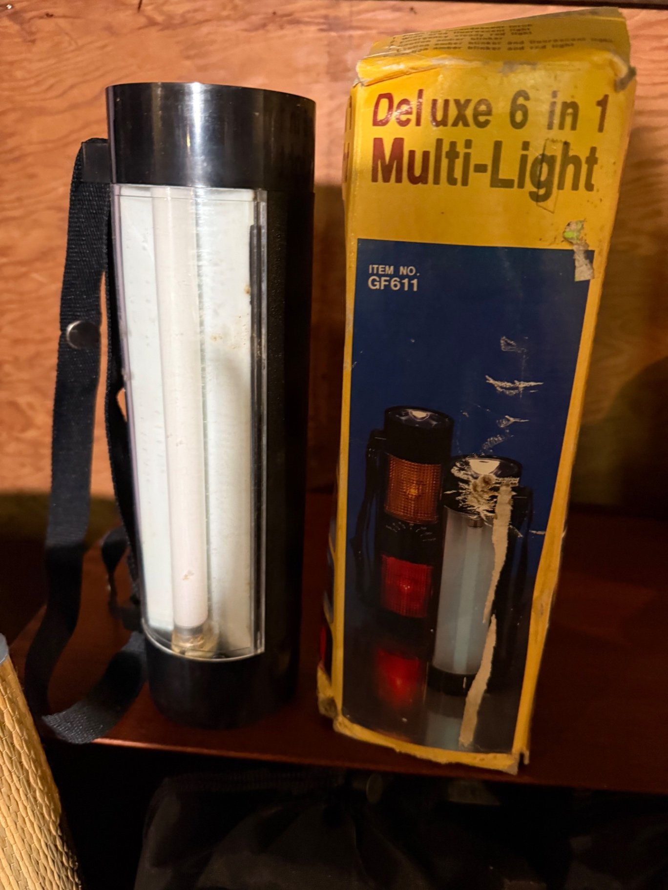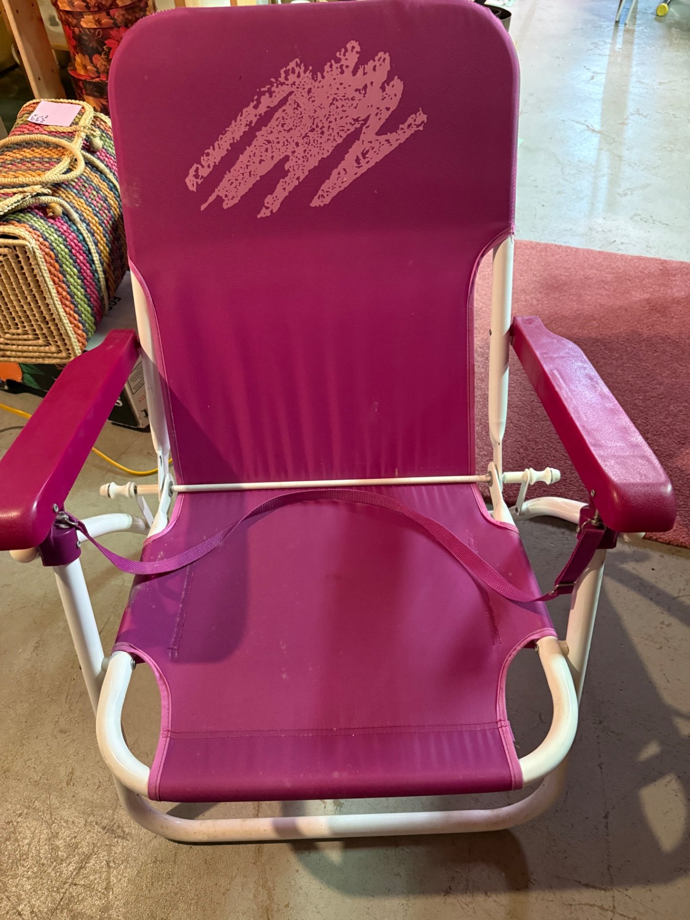 Assorted outdoor and camping items including blue and orange life jackets, a blue diving mask and blue swim goggles, a rainbow-striped wetsuit/vest, a purple folding beach chair, rolled mats and towels, a Coleman cooler, a vintage brown portable chest, and various camping accessories such as folding chairs, umbrellas, and a multi-light flashlight set. **BRING OWN PACKING MATERIALS, AS IS AS FOUND