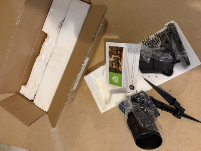 A compact outdoor landscape lighting kit featuring a cylindrical spotlight housing, 4 stake-mounted lights with adjustable brackets, mounting hardware, and foam packaging with an instruction card.
