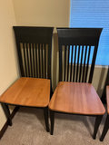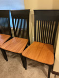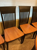 A two-tone wooden dining set consisting of an oval table with a light wood top and dark legs and six matching slat-back chairs with light wood seats. With both leaves in table is 82 inches wide by 46 inches deep and 30 inches tall. Each leaf is 18 inches wide. Includes four seat cushions. Made in Canada