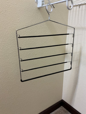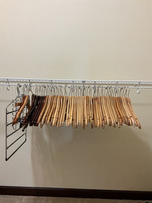 Over fifty wood hangers with a few bonus metal hangers for ties or scarves.